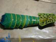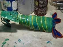would be the segmented shell and that's when all the trouble started, finding a suitable material. Paper was my first choice but painting on the paper produced bleeding of the colors into each other (acrylics are water based). My next not so smart idea was to treat the paper with something like head cement, results; even worse. After much of this useless thrashing about my thoughts turned to plastic of some sort. Here again, more wasted experiments, more swearing, more quitting and starting over. What I need was a flexible plastic material able to take paint, easily cut with scissors, that turned out to be overhead projector film. I could sand it, paint it and it would always remain flexible. Except for the head all of the shrimp was constructed from this material.